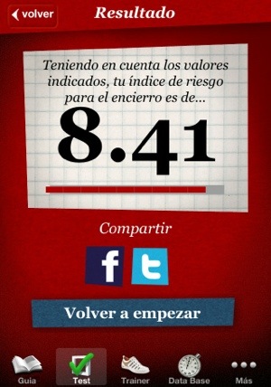 El test nos arroja un índice de riesgo (siendo 10 el riesgo mayor) de sufrir percances si participamos en el encierro, teniendo en cuenta numerosos factores como la edad, condición física, horas de sueño, ingesta de alcohol, experiencia, etc… Hay que tener en cuenta que los resultados de este test son orientativos y que no se debe participar en el encierro si se ha tomado alcohol o cualquier tipo de droga.