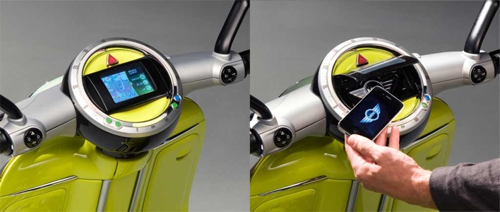Este scooter utiliza un iPhone 4/4s como llave, navegador GPS y panel de datos. En el centro del manillar tiene una consola que alberga el teléfono protegido por una tapa transparente y que conecta la moto al iPhone para desbloquear el arranque, cargar el dispositivo y conectar un manos libres que se complementa con el casco original de la marca que complementa a esta perita en dulce de los caprichosos de las dos ruedas.