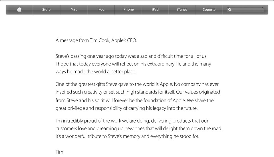 Uno de los mayores regalos que Steve le hizo al mundo es Apple. Ninguna compañía ha inspirado nunca tanta creatividad ni ha establecido tanta alta calidad por sí misma. Nuestros valores originados por Steve y su espíritu, serán por siempre los cimientos de Apple. Compartimos el gran privilegio y responsabilidad de llevar su legado hacia el futuro.