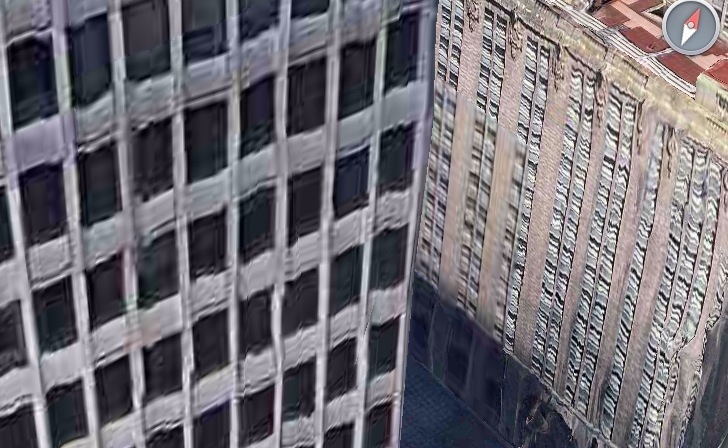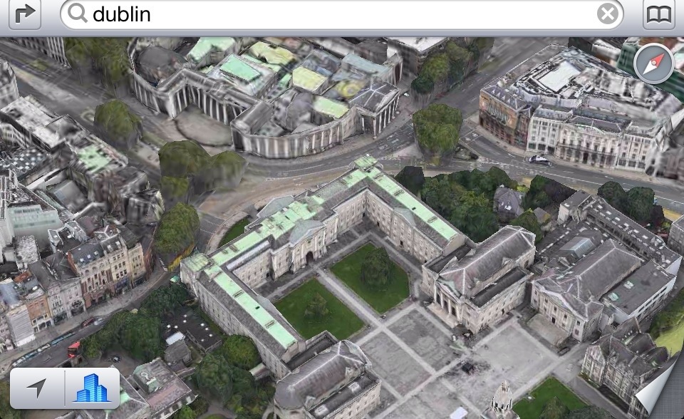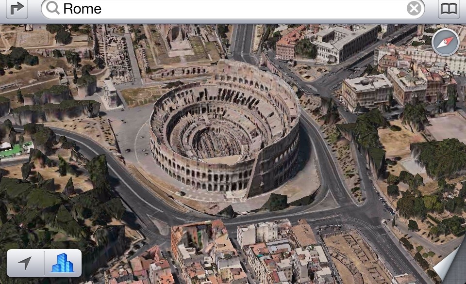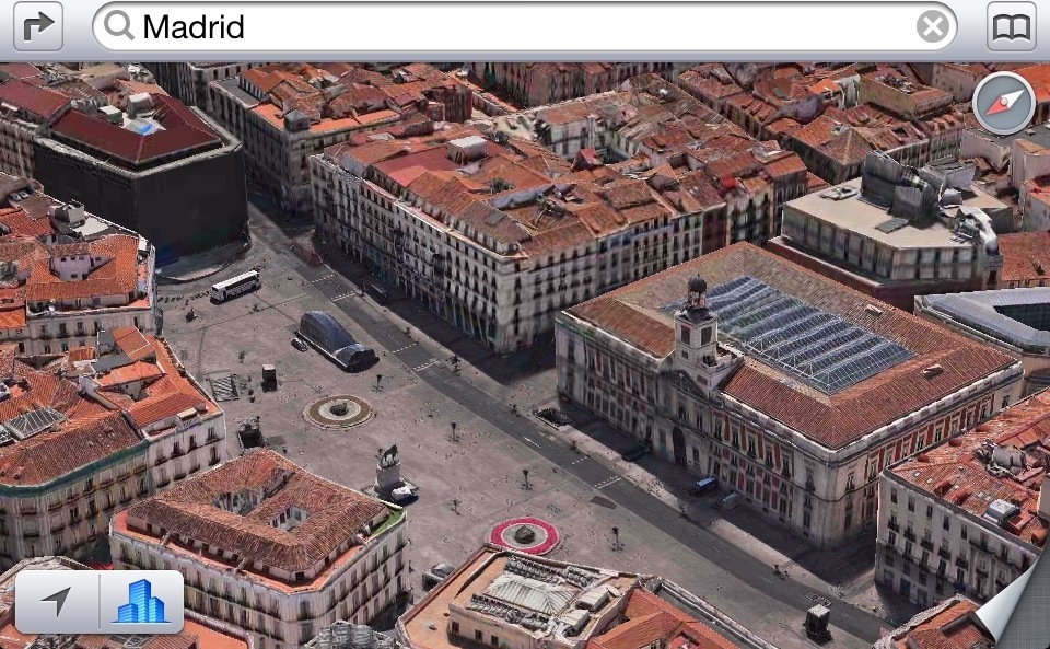 Aunque Flyover no permite bajar más el punto de vista y no podemos igualar la posición de la línea del horizonte con la de la imagen real, lo cierto es que impresiona el realismo de los datos obtenidos por este sistema, a pesar de que los edificios parecen derretirse cuando nos acercamos demasiado, por la falta de linealidad de sus aristas.