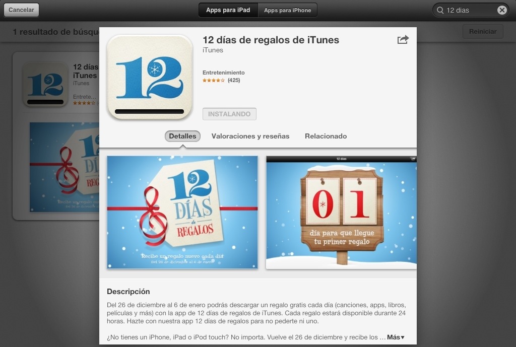 Para todos los usuarios de Mac y Pc, tenéis que acceder a iTunes y buscar en iTunes Store «12 días». Ahí encontraréis toda la información necesaria para descargar los 12 regalos diarios de iTunes, que pueden ser canciones, audiolibros, libros o vídeos.