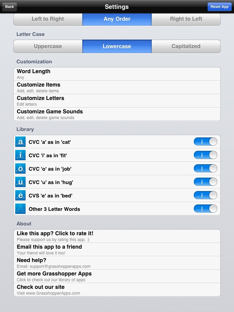 En Letter Order (orden de letras) seleccionamos si queremos que el niño coloque forzosamente las letras de izquierda a derecha (left to right), en cualquier orden (any order) o de derecha a izquierda (right to left).